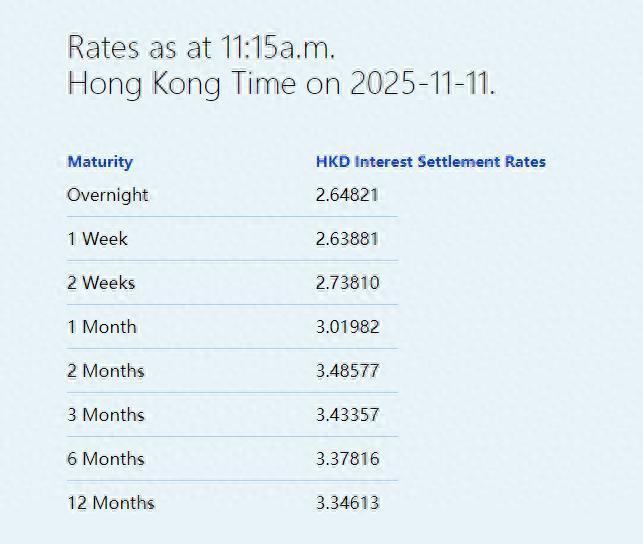 港元拆息普遍回升 隔夜拆息升至2.64821%